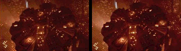 Elliott has built several stereo cameras and also rebuilds vintage 1950's stereo cameras, although he says he had to sell most of his antique cameras to afford more modern gear. He has even done some work for Yoshifumi Yamamoto's Spinner Dokuhon book. He also made a few 3D motion lenticular shots of the photo Deckard holds that comes to life. Unfortunately, the negatives of this were accidentally destroyed. The resolution of the 3D pics on this page had to be seriously reduced so that they would load fairly quickly. Elliott is still learning the digital conversion aspect for posting 3D pictures. Anyone can take 3D photos with absolutely no special equipment. As long as the subject is stationary, all you have to do is shift the camera position, generally with a motorized camera, however, shifting your weight from one foot to the other will give you the usual and customary separation. 3D people call this the "cha-cha" technique. If you want to get a little more technical, buy a piece of aluminum angle stock a few feet long at a hardware store, mount it to a tripod, and slide the camera about 65mm left or right. That'll get you a 3D image, your brain does the work of creating stereo. You can view the prints in an old time stereoscope. The key trick is to keep the camera level, and not to aim it up or down between shots. There is a relation between separation and the amount of stereo the brain can handle. Experiment!